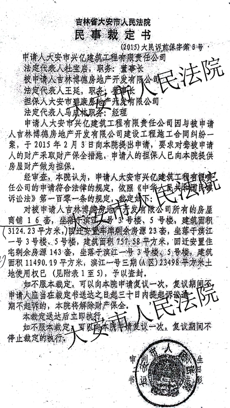 据公开资料显示,滨江一号小区是大安市2013年的棚改项目,开发单位是吉林博德房地产开发有限公司(以下简称博德公司),建筑商是大安市兴亿建筑工程有限责任公司(以下简称兴亿公司)。