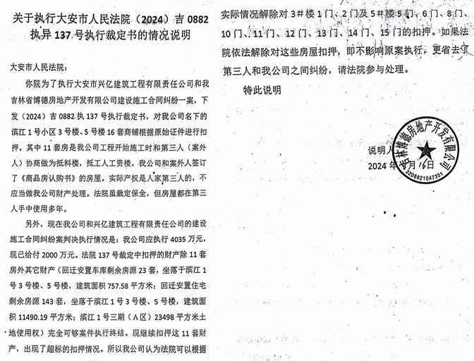 在法院查封后,博德公司曾给法院出具了一个情况说明,即《大安市人民法院(2024)吉0882执异137号执行裁定书的情况说明》,称:“你院为了执行大安市兴亿建筑工程有限责任公司和我吉林省博德房地产开发有限公司建设施工合同纠纷一案,下发(2024)吉0882执137号执行裁定书,对我公司名下的滨江一号小区3号楼、5号楼16套商铺根据原始证件进行扣押。其中11套房是我公司工程开始施工时和第三人(案外人)协商做为抵料楼,抵工人工资楼。我公司和案外人签订了《商品房认购书》的房屋。实际产权是人家第三人的,不应当做我公司财产处理。法院虽裁定保全,但房屋都在第三人手中使用多年。
