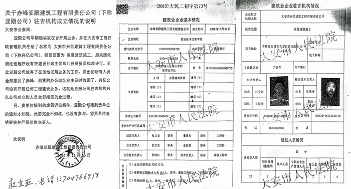 房产被扣押后,材料商们感到不平,开始调查滨江一号的问题并逐级向上反映。调查中,住建局相关负责人曾经向他们确认,兴亿公司在向法院申请查封时提供的担保涉嫌造假,住建局下属单位从来没有给其提供担保。他们还发现,作为建筑商的兴亿公司是一个“冒牌货”,竟然冒用内蒙古赤峰市亚殿建筑工程有限公司(以下简称亚殿公司)的资质施工。之后,他们又到公安部门报案,亚殿公司也给大安市公安局出具了情况说明,但是至今,警方并没有立案,而大安市住建局对此的回应竟是“这是上届领导的错,与现任无关”。在材料商们不断上访反映问题和住建局介入后,大安市法院暂时停止了对抵顶房屋的执行,但是彻底解决滨江一号的问题似乎还遥遥无期。