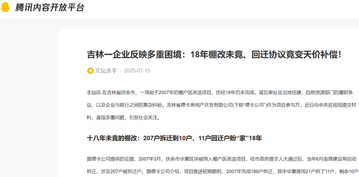 本站讯 在吉林省扶余市,一场始于2007年的棚户区改造项目,历经18年仍未完成,背后牵扯出当地住建、自然资源部门的履职争议,以及企业与银行之间的复杂纠纷。吉林省德卡房地产开发有限公司(下称“德卡公司”)作为项目参与方,近日向中央巡视组提交材料,直指多重问题,引发社会关注。