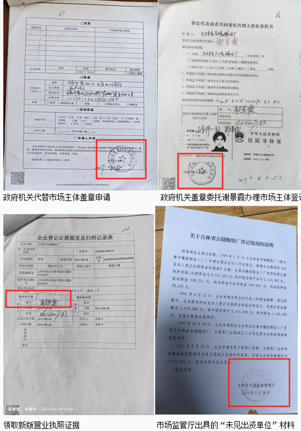 4、“吊销”执照重现市场之谜: 2005年,吉林省吉储橡胶厂营业执照已被依法吊销。在2017年8月28日的变更备案后,宽城区发改局公务人员谢景霞作为“指定代理人”领取了新版营业执照。橡胶厂职工方指认签字证据。但省市场监管厅2024年12月26日在人民网留言板回复时候明确否认颁发了新版营业执照,称虽然委托事项及权限中同意谢景霞领取营业执照和有关文书,但是谢景霞领取的仅为《备案通知书》,且此次备案“不涉及营业执照照面信息变更”。双方说法存在根本性对立。