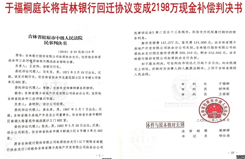 吉林德卡公司遭遇扶余住建局18年棚改未竟、松原中院于福桐庭长将回迁协议变天价补偿!