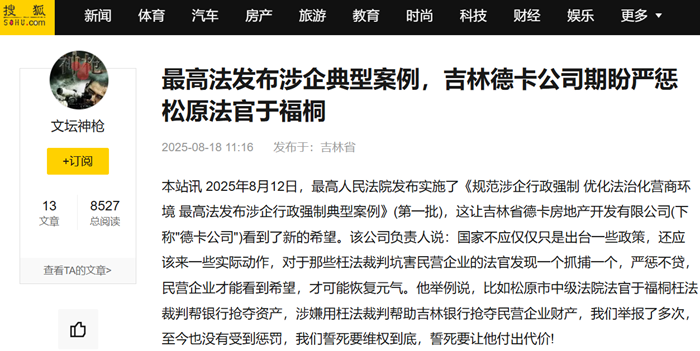 本站讯 2025年8月12日,最高人民法院发布实施了《规范涉企行政强制 优化法治化营商环境 最高法发布涉企行政强制典型案例》(第一批),这让吉林省德卡房地产开发有限公司(下称"德卡公司")看到了新的希望。该公司负责人说:国家不应仅仅只是出台一些政策,还应该来一些实际动作,对于那些枉法裁判坑害民营企业的法官发现一个抓捕一个,严惩不贷,民营企业才能看到希望,才可能恢复元气。他举例说,比如松原市中级法院法官于福桐枉法裁判帮银行抢夺资产,涉嫌用枉法裁判帮助吉林银行抢夺民营企业财产,我们举报了多次,至今也没有受到惩罚,我们誓死要维权到底,誓死要让他付出代价!