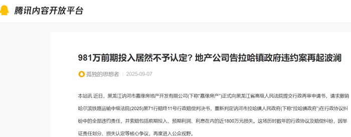 本站讯 近日,黑龙江讷河市嘉缘房地产开发有限公司(下称“嘉缘房产”)正式向黑龙江省高级人民法院提交行政再审申请书,请求撤销哈尔滨铁路运输中级法院(2025)黑71行赔终11号行政赔偿判决书,重新判定讷河市拉哈镇人民政府(下称“拉哈镇政府”)在行政协议纠纷中的全部违约责任,并索赔包括前期投入、预期利润、利息在内的近1800万元损失。这场历时数年的行政协议及赔偿纠纷,因举证责任划分、损失认定等核心争议,再度进入公众视野。