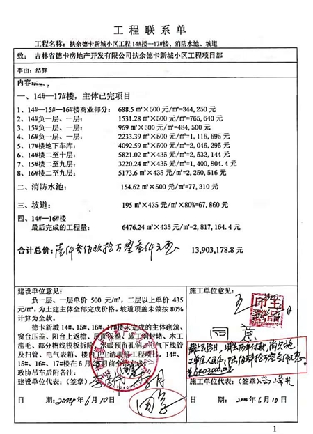 事情还得从2012年说起。那一年,吉林省德卡房地产开发有限公司(简称德卡公司)要在扶余开发德卡新城,身为德惠建工集团有限公司副总经理的王晶就借用惠德公司的资质,与德卡公司签订了建设工程施工合同,约定建设德卡新城一期工程,之后,王晶对德卡新城1#、3#楼进行了施工,又于20013年对德卡新城小区的14#、15#、16#楼及17#楼地下车库进行了施工,但这次没有签订施工合同。到了2014年6月10日,双方开始施工结算。德卡公司方面由总工李月出面,王晶一方由总工尚峰光出面,双方当面确认了施工面积及价款为13903178.8元后,德卡公司一方首先在两份工程联系单上签完字并由德卡公司加盖了公章。但是,代表王晶一方的尚峰光却称自己做不了主,称需要拿回去两份工程联系单让王晶签字盖章。