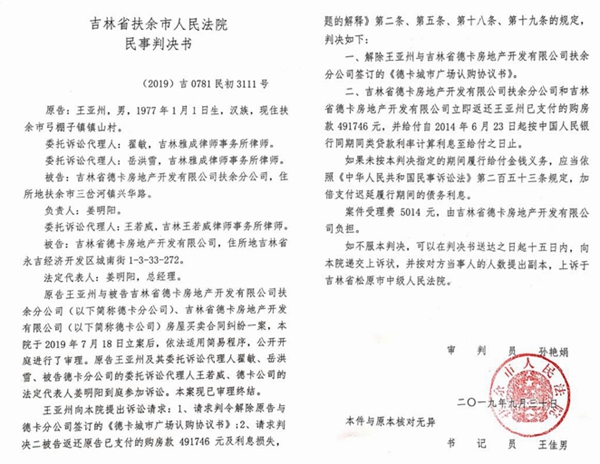 据介绍,德卡公司(全名:吉林省德卡房地产开发有限公司)成立于2000年4月,2004年,其通过招商引资途径进入松原市下辖的扶余县(后撤县改市),全额垫资建县医院、棚户区改造、给政府拆迁退道路红线,为当地解决2000多人就业,累计利税近5000万元。但是在2019年7月,德卡公司却被王亚洲等十四个买房户起诉了。王亚州等14个买房户向法院提出诉讼的主要请求是: 判令解除原告与德卡分公司签订的《德卡城市广场认购协议书》;请求判决被告返还原告已支付的购房款及利息损失。其在法庭上阐述的事实和理由是:原告与徳卡分公司分别于2014年6月签订了《徳卡城市广场认购协议书》,约定原告向德卡分公司购买徳卡城市广场的产权商铺,双方约定原告一次性付款。在合同履行过程中,被告存在未办理合法验收手续、消防不合格、超面积占用土地、违反规划批准的容积率等违约行为,由于被告诸多违约行为,导致原告购买商铺的合同目的无法实现,严重损害了原告的合法权益。