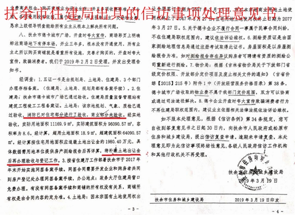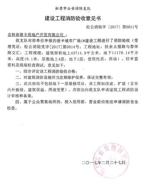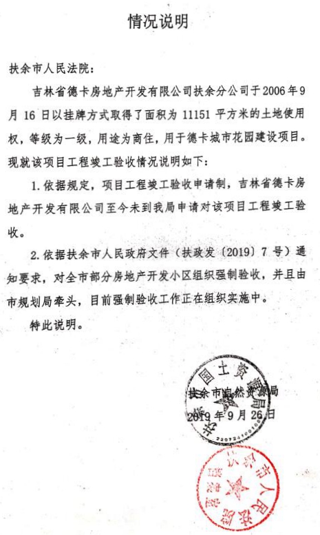 为证明扶余市住建局和自然资源局给法院出具的是假证,德卡公司给记者提供了相关证据。记者看到:1、建设用地规划许可证批的是122900万平方米,发改局文件(扶发改法[2015]88号)批的建筑面积也是122900平方米,以上两个批件证明德卡公司没有超建筑面积;2、2017年2月27日,松原市公安局消防支队给德卡公司出具的《建设工程消防验收意见书》(松公消检字{2017}第0011号)称:“我支队对你单位申报的德卡城市广场建设工程进行了消防验收…… 综合评定该工程消防验收合格。”但是,扶余法院在其2019年9月做出的判决书中却称德卡公司城市广场“商业部分消防未验收”;3、2019年6月11日,扶余市人民政府关于印发《加快推进解决全市部分房地产开发小区历史遗留问题实施方案的通知》(扶政发{2019}7号),其中对德卡公司的土地问题称:“该公司土地出让金按合同约定。”德卡公司提供的另一份政府文件证实,其已交土地出让金。德卡公司发现这份文件还证明了:扶余市近十多年所有房地产开发的项目,土地局都没有验收和欠大量的土地出让金,但是,扶余法院却只说德卡公司至今没到土地局申请对项目工程竣工验收。德卡公司认为:这明显是针对他们的,是有预谋的;4、建筑工程竣工工程备案证书和已办理的三户产权证照或称不动产登记证,这些证据证明德卡城市广场建设项目没有违约。