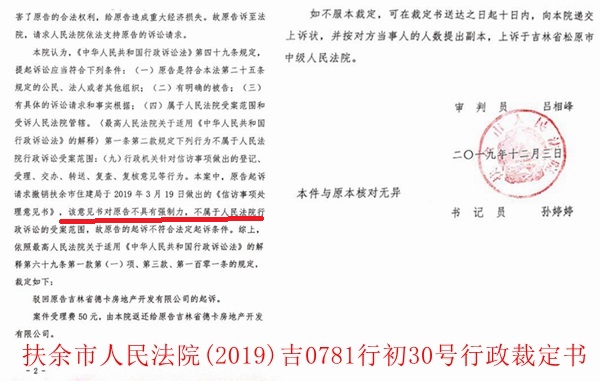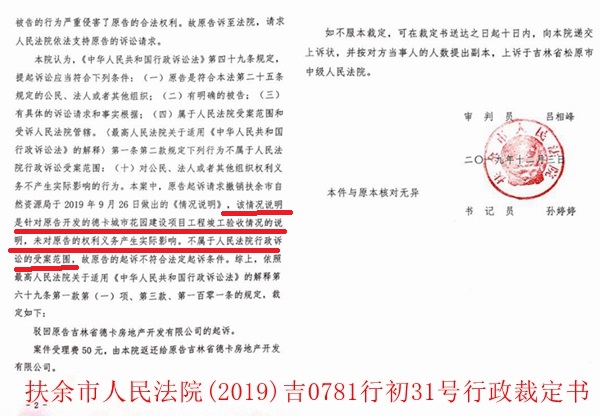 本站讯 2019年12月3日,吉林省扶余市人民法院同时做出 (2019)吉0781行初30号和行初31号两个行政裁定书,一并驳回了德卡公司对于该市住建局和自然资源局(原名:国土资源局)的行政诉讼。而在此前,当地14家购房户刚刚起诉并胜诉德卡公司,法院判德卡公司根本违约,其依据的就是住建局和自然资源局出具的证明材料。德卡公司认为,扶余市法院这样做纯粹是自判自裁,是违法的,其目的是为两部门出具假证站队、背书,甚至可以说是法院与两部门合谋用假证据谋害企业,是对法治精神的亵渎,德卡公司一定要讨个说法。