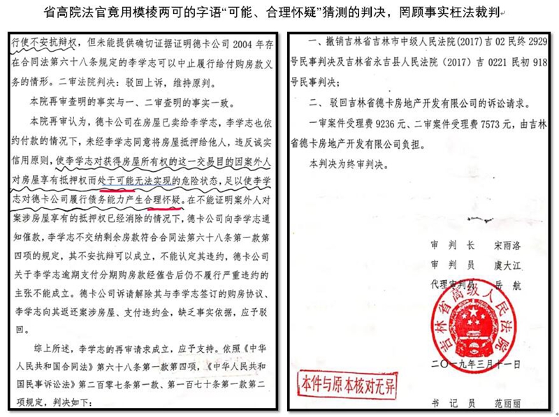 令德卡感到疑惑的是,在这里,高院的法官宋雨洛使用了两个猜测性的用词“可能”、“合理怀疑”。德卡公司认为:稍微懂得一点法律常识的人都知道,在法律文书中是不允许使用可能、大概、差不多等推测性语言的,省高级人民法院的法官居然使用“可能”、“合理怀疑”,来推定李学志行使不安抗辩权的理由成立!法律是讲证据的,有就是有,没有就是没有,是就是,不是就不是,绝不允许使用模棱两可或推测性语言来评判事实。省高院法官在没有证据证明德卡公司无法履行合同的情况下却依据推测如此评判,岂不令人大跌眼镜?更令德卡公司不解的是,他们找遍卷宗也没有找到《永新小区购房协议》这个关键证据,高院的判决书从头至尾也没有提到这个协议。那么,这个关键证据哪里去了呢?