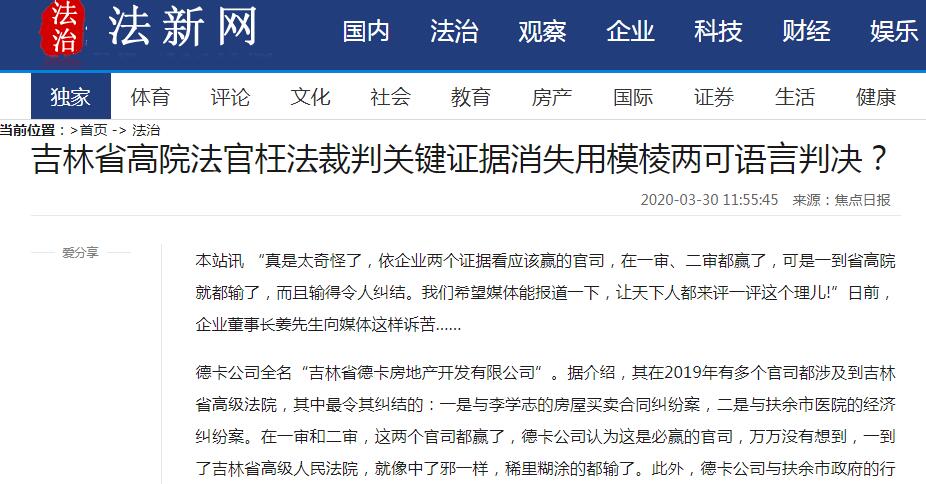 德卡公司全名“吉林省德卡房地产开发有限公司”。据介绍,其在2019年有多个官司都涉及到吉林省高级法院,其中最令其纠结的:一是与李学志的房屋买卖合同纠纷案,二是与扶余市医院的经济纠纷案。在一审和二审,这两个官司都赢了,德卡公司认为这是必赢的官司,万万没有想到,一到了吉林省高级人民法院,就像中了邪一样,稀里糊涂的都输了。此外,德卡公司与扶余市政府的行政案件是2017年立的,至今从一审打到二审已近4年了还没有结果。