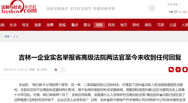 至此,德卡公司感到已经没有其他办法维权了,只有通过媒体曝光和举报来维权了。于是,2020年7月10日,德卡公司姜先生将宋雨洛实名举报到省高院纪检委等有关部门,但至今也没有收到任何答复。
