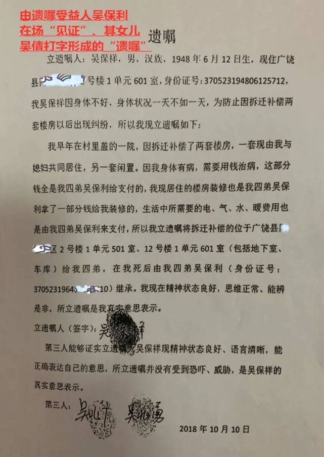 经广饶县法院审理查明:2018年10月10日,吴保祥找到吴家社区党支部书记吴兆广,要求立遗嘱,吴兆广通知支部委员吴兆勇一起到社区办公室见证此事,吴兆广又通知吴倩(吴保利的女儿)到办公室打印,遗嘱打好后,吴兆广为吴保祥宣读了遗嘱内容“我早年在村里盖的一院,因拆qian补偿了两套楼房,一套现由我与媳妇共同居住,另一套闲置。因我身体有病,需要用钱治病,这部分钱全是我四弟吴保利给支付的,我现居住的楼房装修也是我四弟吴保利拿了一部分钱给我装修的,生活中所需要的电、气、水、暖费用也是由我四弟吴保利来支付,所以我立遗嘱将拆qian补偿的位于广饶县某小区2号楼1单元501室、12号楼1单元601室(包括地下室、车库)给我四弟,在我过世后由我四弟吴保利继承。我现在精神状态良好,思维正常、能辨是非,所立遗嘱是我真实意思表示。立遗嘱人(签字):吴保祥第三人能够证实立遗嘱人吴保祥现精神状态良好、语言清晰,能正确表达自己的意思,所立遗嘱并没有受到恐吓、威胁,是吴保祥的真实意思表示。第三人:吴兆广吴兆勇2018年10月10日”。