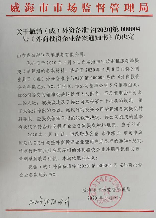 2020年9月4日,彩联公司接到威海中院发来的威海市中级人民法院(2020)鲁10行初68号《行政裁定书》,裁定书称:“彩联公司在起诉时提交了《外商投资企业备案通知书》,但威海市市场监督管理局于2020年8月5日作出《关于撤销(威)外资备准字【2020】第000004号《外商投资企业备案通知书》的决定》,撤销彩联公司的清算组备案登记,故彩联公司未能提供证据证明其合法成立清算组进行清算,其以清算组负责人代表公司参加诉讼不符合法律规定。”裁定“驳回原告山东威海彩联汽车服务有限公司的起诉”。