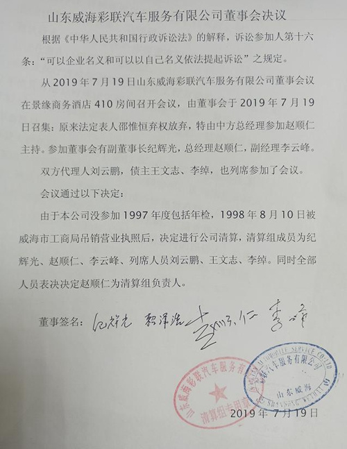 2019年11月21日,在邵某某拒绝参加董事会的情况下,4名董事召开董事会,并作出《董事会决议》:“经董事大会决定,免去邵某某山东威海彩联汽车服务有限公司法定代表人。董事大会决定任命刘某某为法定代表人、清欠组组长”。