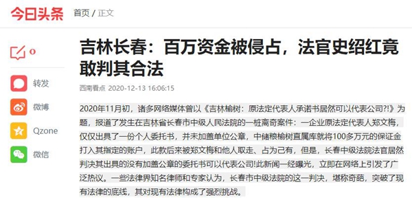 本站讯 2020年11月初,诸多网络媒体曾以《吉林榆树:原法定代表人承诺书居然可以代表公司?!》为题,报道了发生在吉林省长春市中级人民法院的一桩离奇案件:一企业原法定代表人郑文梅,仅仅出具了一份个人委托书,并未加盖单位公章,中储粮榆树直属库就将100多万元的保证金打入其指定的账户,此款后来被郑文梅和他人取走、占为己有,但是,长春中级法院法官居然判决其出具的没有加盖公章的委托书可以代表公司!此新闻一经曝光,立即在网络上引发了广泛热议。一些法律界知名律师和专家认为,长春市中级法院的这一判决,堪称奇葩,突破了现有法律的底线,其对现有法律构成了强烈挑战。