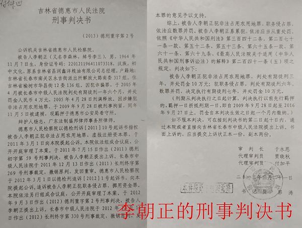 李朝正(原名李森林、绰号李三)是一个十恶不赦的犯罪分子,2005年因诈骗罪被榆树法院判处有期徒刑十年,通过关系一年就出狱了(自己说为此花了500万)。出狱后,他将自己名字由李森林改为李朝正,但实际上他并没有改邪归正,还是一个十足的涉黑涉恶的犯罪分子,几年来又多次犯罪,一是2007至2009年非法占用农业耕地6万平米,搞非法施工建设, 榆树土地和电力等监察部门出面制止都被他非打即骂给赶走了,叫嚣:滚回去让你们局长来。后因有保护伞从此违法施工再没人阻止了:二是2009年4月因开报废车上公路运砖,不服警察管教,还故意开车撞伤警察,被榆树公安局刑事拘留10天后,因有保护伞被取保候审:三是2009年9月三是又因职务侵占、挪用、非法占用农用耕地等罪名,被德惠市人民法院一审判处有期徒刑15年,后又因干预改判7年;四是2016年出狱后,就带领社会闲杂人员10余人到受害方申请法院查封的财产处,撕掉法院封条,将房门锁砸碎,谩骂威胁看管人员,将他们撵到房间内不许出屋,拿走什么东西看管人员也说不清楚。我司在他们走后到属地派出所报案,同时向查封法院也作了反应,现一年多过去了,也没有什么处理结果,对投资人王忠昌、付维佳的820余万元欠款法院生效判决已有4年,由于李朝正和郑文梅通过各种关系的干扰至今无法执行回来。