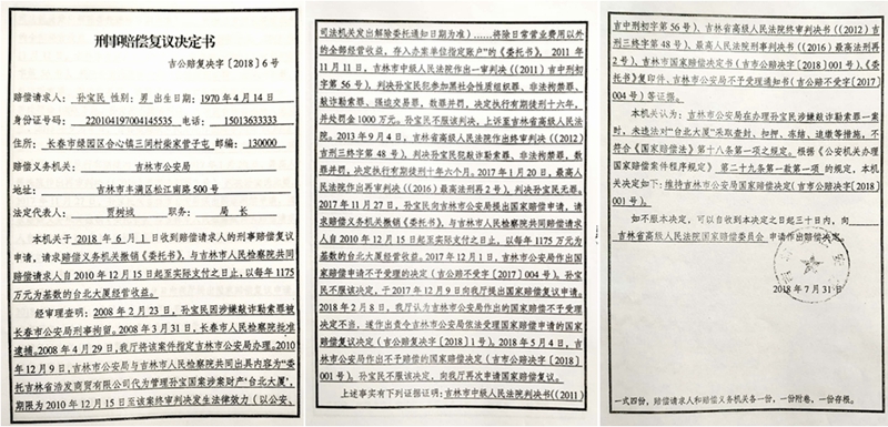 得到省公安厅的复议决定书,孙宝民似乎看到了希望,但吉林市公安局随后又于2018年5月4日做出吉市公赔决字[2018] 001号国家赔偿决定书,又称:“本机关认为,吉林市公安局在办理孙宝民等人涉嫌犯罪过程中,对‘台北大厦’未违法采取查封、扣押、冻结、追缴等等措施,对赔偿申请人孙宝民提出的国家赔偿申请,不予支持。”
