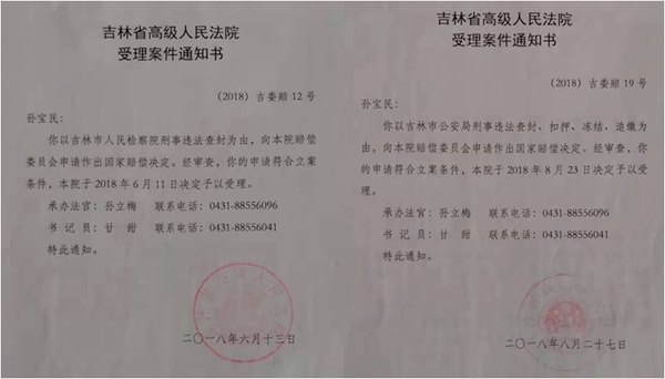 同年8月28日,省高院给孙宝民发出(2018)吉委赔12号合并审理通知书称:“孙宝民:你向本院分别申请吉林市人民检察院、吉林市公安局刑事违法采取财产类强制措施国家赔偿一案,本院于2018年6月11日、8月24日依法立案受理。本院赔偿委员会经研究,决定对上述两个案件进行合并审理。”
