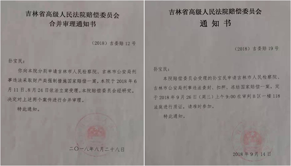 同年9月14日,省高院赔偿委员会给孙宝民发出通知书称:“孙宝民:本院赔偿委员会受理的孙宝民申请吉林市人民检察院、吉林市公安局刑事违法查封、扣押、冻结国家赔偿一案,定于2018年9月26日(周三)上午9:00在审判B区一楼118法庭进行质证,请准时参加。”