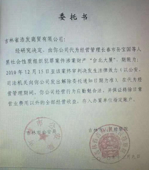 孙宝民出事后,2010年12月9日,吉林市公安局和吉林市人民检察院向吉林省浩发商贸有限公司出具《委托书》。该委托书载明:“经研究决定,由你公司代为经营管理长春市孙宝国等人黑社会性质组织犯罪案件涉案财产‘台北大厦’,期限为: 2010年12月15日至该案终审判决发生法律效力( 以公安、司法机关向你公司发出解除委托通知日期为准)。在代为经营管理期间,你公司经营行为应勤勉合法,并保证将除日常营业费用以外的全部经营收益,存入办案单位指定账户。”该委托书在落款处加盖了吉林市公安局、吉林市人民检察院二单位的公章。