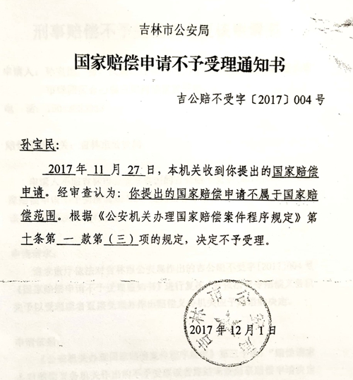 2017年12月1日,吉林市公安局对孙宝民做出国家赔偿不予受理通知书(吉公赔不受字[2017]004号)称:“经审查认为,你提出的国家赔偿申请不属于国家赔偿范围.....决定不予受理。”