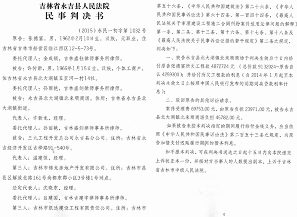 张德富是吉林省吉林市人,曾经当过兵,是一名退伍军人,退伍后干过一些工程。他向记者介绍:2012年7月,张德富与永吉县北大壶镇内的许传新签订了建筑施工合同,并同时进场施工。2013年10月30日竣工,并通过验收合格已使用。之后在结算工程款的过程中,两人出现分歧。2013年10月10日,张和另外两人将工程结算书送达许传新的传新影楼,许拒绝签字,许认为楼盖完了,也开始使用了,不给结算就给不了工程款。无奈之下,张德富只好将许传新诉至法院要求其给付工程款,永吉县法院经开庭审理分别做出(2015)永民一初字第1031号和(2015)永民一初字第1032号两个判决,其中(2015)永民一初字第1032号这样记载: