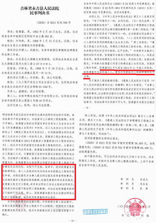 对此,许传新不服,上诉至吉林市中级法院,吉林市中法通过开庭审理,判决维持原判,之后又以双方当事人不同意做工程造价鉴定为由发回重审,发回重审后,永吉县法院以同样的理由改判,(2017)吉0221民初5号判决书驳回了张德富的诉讼请求。张德富又上诉到吉林市中院。2017年12月20日,吉林市中院通过开庭审理,作出了(2017)吉02民终2522号终审判决,认定(2017)吉0221民初5号判决适用法律错误,依法判决给付张德富工程款340多万元及利息。