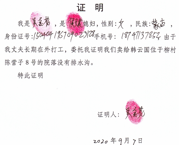 判决做出后,韩云国、王秀英不服,他们说:自家购买房子的院内根本就不曾存在过排水沟,同时,原来的房主也出来作证:“我们卖给韩云国位于柳村陈营子8号的院落没有排水沟。”但是,这一关键证据并没有被法院采信,甚至连提都没有提。他们认为,法官是用推测、分析做出的判决,是枉法裁判,遂提起了上诉。其在上诉状中称: