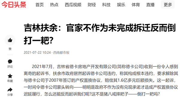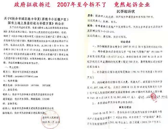 本站讯 2021年7月,吉林省德卡房地产开发有限公司(简称德卡公司)收到一份令人感到离奇的起诉书,扶余市政府居然起诉德卡公司违约,称其构成根本违约,要求解除其与德卡公司于2007年签订的产权置换协议,赔偿其1.6亿多元巨额损失。这一起诉,一时间令德卡公司蒙头转向——明明是政府不作为没有兑现承诺才造成产权置换协议迟延履行,怎么还能反而起诉我们呢?这不是猪八戒摔耙子——倒打一耙吗?