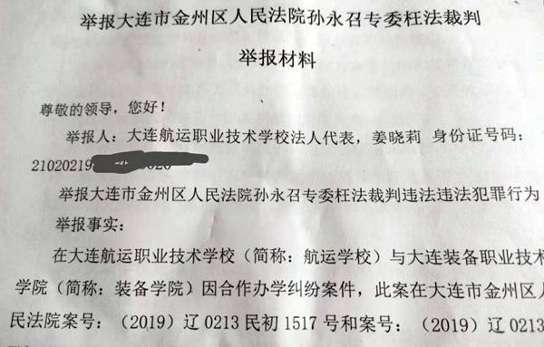 事情的经过得从2012年说起。这一年,刚到大连不久,成立大连装备制造职业技术学院的黄腾,与本土办学多年的姜晓莉进行合作,姜晓莉与黄腾签订了十年的合同,她为黄腾提供航海教学设备和师资力量,同时负责向国家海事局申报“船员培训资质”,姜晓莉的大连航运职业技术学校则变成装备制造学院的一个分院。姜晓莉说,一切妥当,愉快的合作开始了,船员培训很快红火起来,2014年被航运业内人评为“船员最受信赖的培训机构”。但好景不长,当时负责学校食堂、超市等后勤工作的村书记刘宝汉发现办学很挣钱,惦记着为儿子置办这个产业,于是他利用各种手段搅乱办学,很快这家大学成了他儿子刘述龙的了,逼黄腾败走大连,姜晓莉的厄运也从此开始了。