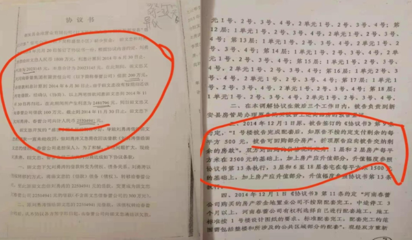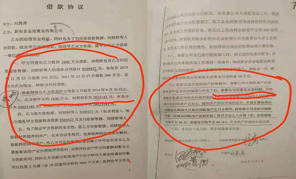 一,田文忠向媒体举报:在2012年7月至2014年1月期间,洛阳金地置业有限公司因资金不足向徐六生借款共计1271万元。徐六生通过“套路贷”手段,至2014年12月就将借款虚增到了25,504,941元,并以此借款逼迫金地公司与徐六生控制的春蕾公司签署了债权转换为购房款的协议,将金地公司价值4700多万元的109套房产和价值2000多万的商铺预售登记在了春蕾公司名下。