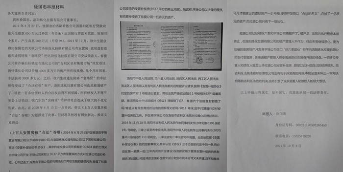 三,徐国忠向媒体举报:2014年8月27日,徐国忠的洛阳希恩公司,因需归还银行贷款,向徐六生借款600万元。后因银行未放贷,短短三个多月的时间,徐六生就将利息虚增到了200万元。2014年12月,徐六生团伙得知徐国忠的关联公司洛阳炼化拉膜有限公司有安置房,就用虚假借据和虚假转账“套路贷”的手段,把洛阳炼化拉膜有限公司变成借款人,诱使炼化公司以价值4000多万元的房产所有权抵债。之后,徐六生将“套路贷”的非法所得,通过法院判决变成了“合法有效”的财产,几个月时间里,就非法获利3000多万元。洛阳炼化拉膜有限公司由此被逼破产了。