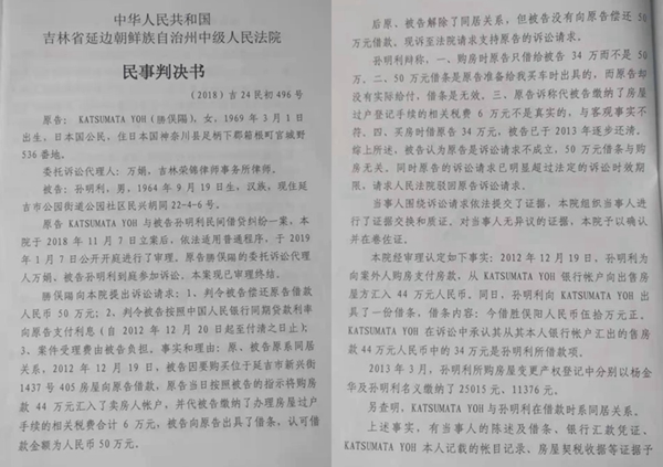 在勝俣陽看来,延边中院的判决是公正的。延边中院(2018)吉24民初496号民事判决书对此案是这样记载的: