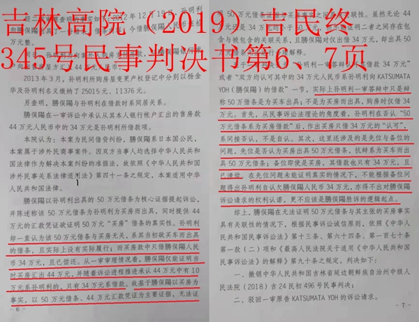 孙明利对延边中院作出的判决不服,向吉林高院提出上诉,吉林高院于2019年9月16日作出(2019)吉民终345号民事判决书,判决撤销延边中院的一审判决,驳回勝俣陽的诉讼请求。