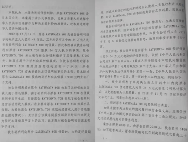 2018年11月7日,勝俣陽因与孙明利之间民间借贷一案,将孙明利起诉至延边中院,延边中院经开庭审理,作出(2018)吉24民初496号民事判决书,判决孙明利向勝俣陽偿还借款34万元及利息。