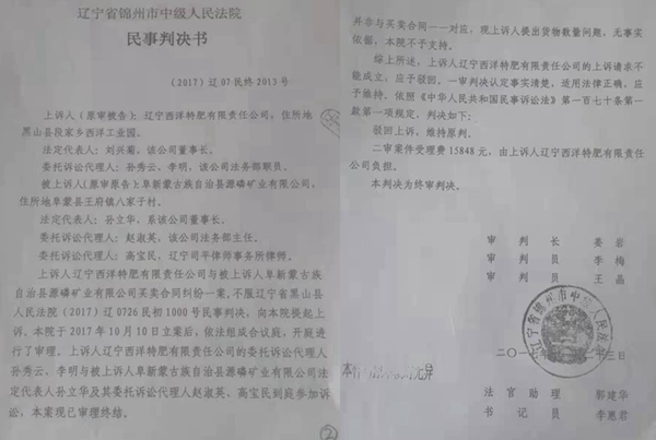 记者最先拿到的,是锦州市中级法院关于西洋肥业与阜蒙县源磷矿业有限公司的一份民事判决书,判决的内容十分简单,先是维持了一审法院黑山县法院的一审判决,认为一审判决准确无误,同时二审的审理费15848 元还得西洋肥业来给付。