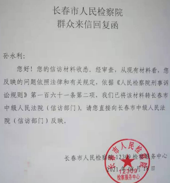 2021年8月18日,孙永利接到长春市人民检察院的《群众来信回复函》,该回复函称:“经审查,从现有材料看,您反映的问题依照法律和有关规定,依据《人民检察院刑事诉讼规则》第一百六十一条第二项,我们已将该材料转长春市中级人民法院(信访部门),请您直接向长春市中级法院(信访部门)反映。”孙永利气愤的说:我实名举报原长春市中级法院、现吉林省高级人民法院法官董惟祎枉法裁判,长春市检察院却将董惟祎案直接变成了信访案件,把皮球踢给长春市中级法院,而省高院竟然公开包庇,竟称董惟祎在办理我的案子中不存在违规问题,这明显是在包庇法官,我一定要举报到底,直到董惟祎和包庇她的人都受到严惩!