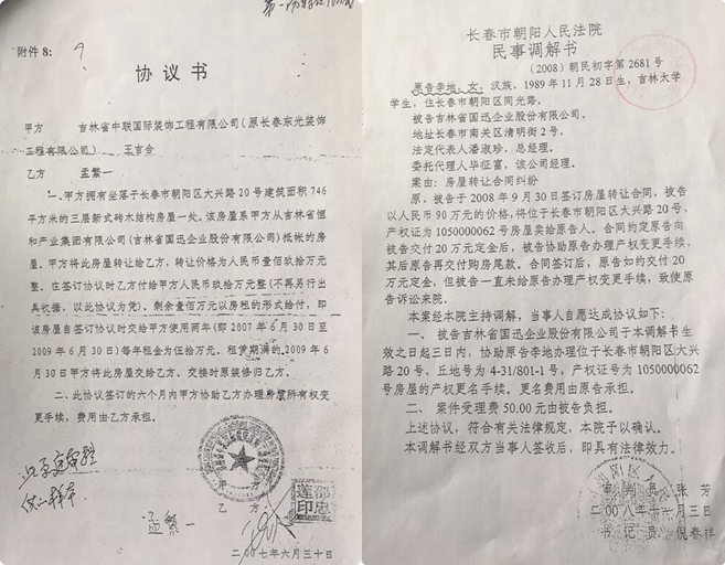 公开资料显示,李地是吉林大学行政学院科研办公室主任,具体负责科研、学科建设、国内学术会议会务筹备及组织工作。进一步调查得知,李地还是孟繁甲的女儿。看到李地的起诉书,中联公司才得知:孟繁甲用中联公司提供的四张空白信件,弄出了2007年6月30日孟繁一(孟繁甲之弟)与中联公司职工王吉和签订的房屋转让协议书,李地就是依据此协议提起诉讼的。该协议约定:中联公司拥有抵债房屋。该房屋系中联公司从恒和集团(国迅公司)抵账的房屋。中联公司将此房以190万元价格转让给孟繁一。在签订协议时,孟繁一付给中联公司90万元整(不再另行出具收据,以此协议为凭)。剩余100万元以房租的形式给付,即该房屋自签订协议时交给中联公司使用两年(即2007年6月30日至2009年6月30日),每年租金为50万元。租赁期满,2009年6月30日中联公司将此房交给孟繁一,交接时原装修饰物归孟繁一。在此协议签订后的六个月内,中联公司协助孟繁一办理房屋所有权变更手续。