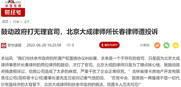 本站讯 “我们与扶余市政府的所谓产权置换协议纠纷案,本来是一个不存在的官司,只是因为北京大成律师事务所长春律所的两位律师的鼓动,才打了官司。北京大成的律师只是为了赚点昧心钱,就鼓动政府搞虚假诉讼,给我公司造成了太多的麻烦,严重干扰了企业正常经营。”吉林省德卡房地产开发有限责任公司(简称德卡公司)董事长姜先生日前对记者气愤的说,“在党中央、国务院一再强调不惜一切代价恢复经济的大背景下,北京大成律师和扶余市政府的做法,简直令人忍无可忍!”