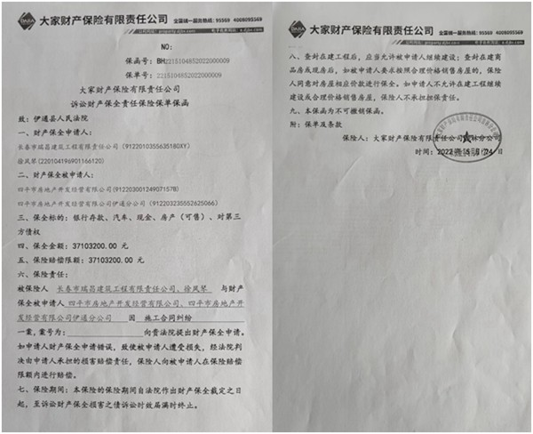 为了要回垫付的工程款,今年5月23日,徐凤琴向伊通县法院提起民事诉讼,要求伊通分公司给付工程款款3710.32万元及利息。因为徐凤琴没钱缴纳诉讼费,被法院裁定驳回起诉。2022年6月1日,徐凤琴再次向伊通法院递交了起诉状,伊通县法院以简易程序正式立案。同时,徐凤琴还递交了保全申请书和保险公司出具的担保函,要求诉中保全,并于当日缴纳了诉讼费、保全费。