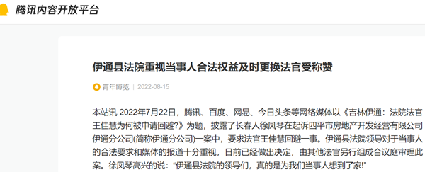 本站讯 2022年7月22日,腾讯、百度、网易、今日头条等网络媒体以《吉林伊通:法院法官王佳慧为何被申请回避?》为题,披露了长春人徐凤琴在起诉四平市房地产开发经营有限公司伊通分公司(简称伊通分公司)一案中,要求法官王佳慧回避一事。伊通县法院领导对于当事人的合法要求和媒体的报道十分重视,日前已经做出决定,由其他法官另行组成合议庭审理此案。徐凤琴高兴的说:“伊通县法院的领导们,真的是为我们当事人想到了家!”