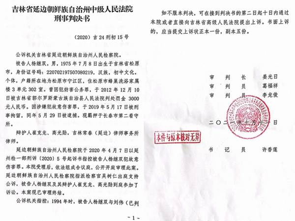 延边州中级法院依据后补的卷宗,经异地审理,做出(2020)吉24刑初15号刑事判决书,以故意伤害罪判处杨继双有期徒刑四年。延边州的刑事判决书对杨继双的犯罪事实是这样认定的: