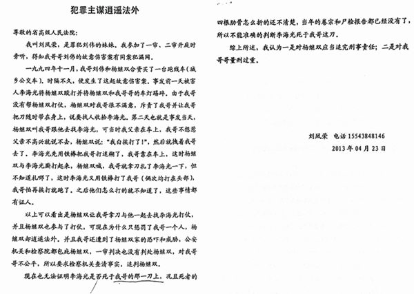 刘凤荣在她写的《犯罪主谋逍遥法外》一文中说:“事发前一天......由于我哥没有帮杨继双打仗,杨继双对我哥很不满意,斥责了我哥并让我哥把刀随时带在身上,说要找人收拾李海光。第二天也就是事发当天,杨继双叫我哥跟他去找李海光,可当时我父亲在车上,我哥不想惹父亲不高兴就说不去,杨继双说:“我白挨打了!”,然后就拽着我哥去了。李海光先用铁棒把我哥打迷糊了,我哥靠在车上,这时杨继双与李海光厮打起来,杨继双喊,我哥就拿刀扎了李海光一下,但不知道扎哪了。”“以上可以看出是杨继双让我哥拿刀与他一起去找李海光打仗,并且杨继双也参与了打仗,可现在为什么只惩罚了我哥一个人,杨继双却逍遥法外。并且,我哥还遭到了杨继双家的恐吓和威胁,公安机关和检察院都包庇杨继双,一审判决也没有判处杨继双,对我哥哥不公平,所以要求检察机关查清事实,追判杨继双。”