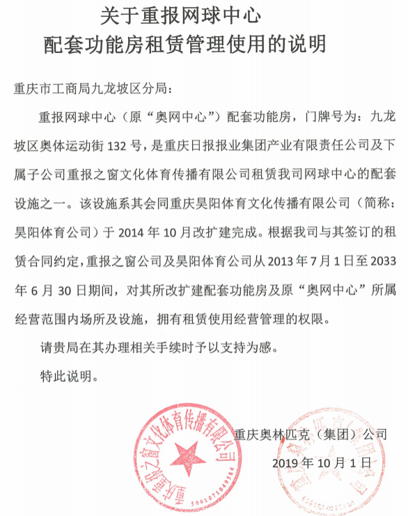 1、2020年9月24日,昊阳公司将位于重庆市九龙波区奥体运动街132号“奥网中心”管理用房第三层、第二层部分(含厨房及办公室)、厨卫及餐饮经营用品等设施设备租赁给食在一方用于餐饮服务项目,其中明确了租赁期限为2020年10月1日至2025年9月30日止。食在一方以重庆奥林匹克(集团)公司名下的位于重庆市九龙坡区奥体运动街132号房屋产权证复印件(114房地证2007字第033821号),在工商注册了重庆食在一方文化有限公司。但位于重庆市九龙波区奥体运动街132号“奥网中心”管理用房第三层、第二层部分(含厨房及办公室),大部分面积是违法建筑,重庆重报之窗文化传播有限公司(以下简称重报之窗)明名知食在一方所租赁的房屋大部分面积是违法建筑,反而却与昊阳公司串通一气将该房屋租赁给食在一方经营餐饮服务项目,故意隐瞒违法建筑虚设消防喷淋设施,违背道德底线和个人良知,重报之窗出据虚假证明,重庆食在一方公司顺利注册公司营业执照,地址在被隐瞒违法的建筑之内,实则重报之窗成为了昊阳公司违法违规的保护伞。重报之窗违法逐利,强烈呼吁相关部门严肃查处,还社会公平正义。