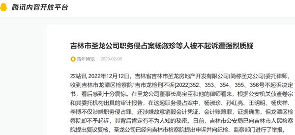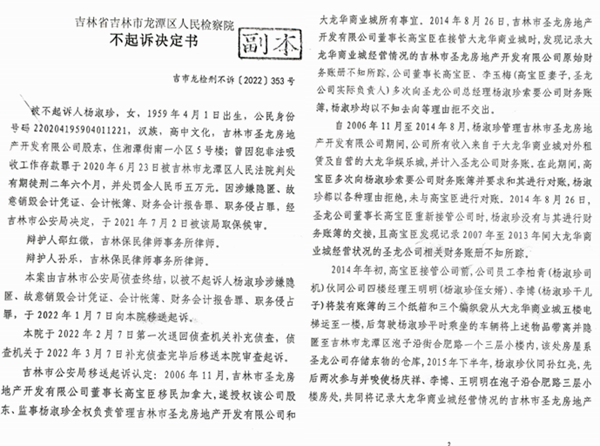 本站讯 2022年12月12日,吉林省吉林市圣龙房地产开发有限公司(简称圣龙公司)委托律师,收到吉林市龙潭区检察院“吉市龙检刑不诉[2022]352、353、354、355、356号不起诉决定书,看后感到十分震惊。在圣龙公司董事长高宝臣和他的律师看来,根据公安机关侦查卷宗和其委托机构出具的审计报告,在这起职务侵占案中,杨淑珍、孙红亮、王明明、杨庆祥、李博不仅涉嫌职务侵占罪,还涉嫌故意销毁会计凭证、会计账簿罪,证据确凿,但龙潭区检察院却不予起诉,其背后肯定有不为人知的秘密。日前,吉林市公安局已向吉林市人民检察院提出复议复核,圣龙公司已经向吉林市检察院提出申诉并向纪检、监察部门进行了举报。