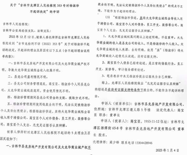 2022年12月12日,圣龙公司收到对杨淑珍等五人的不起诉决定书后,很快就提出申诉,其陈述的事实理由如下: