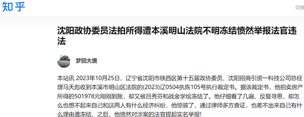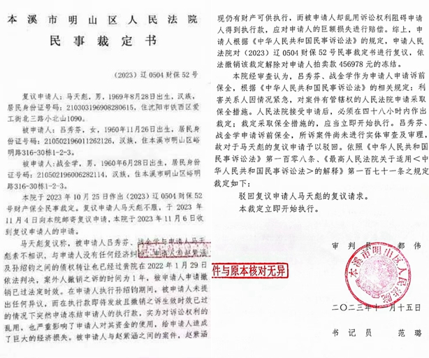 本站讯 2023年10月25日,辽宁省沈阳市铁西区第十五届政协委员、沈阳招商引资一科技公司总经理马天彪收到本溪市明山区法院的(2023)辽0504执恢105号执行裁定书。据该裁定书,他拍卖房产所得的501978元刚刚到账,却又被吕秀芬和战金学给冻结了。他仔细看了几遍,反复寻思,却怎么也想不起来自己和这两人有什么经济纠纷,他惊骇了,通过律师多方查证,也差不出来自己有什么理由遭冻结,之后,他愤然对涉案的法官提起实名举报!