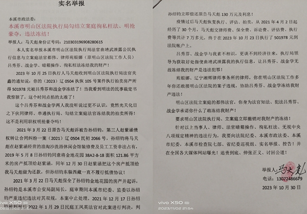 马天彪在举报信中说:(2023)辽0504执恢105号执行裁定书在时间点上掐的太准了,他费尽周折刚刚执行回来了这50多万元,法院马上就惦记上了。这个吕秀芬和战金学两人我没听说过,更不认识,竟然光天化日之下伙同律师、串通执行局、勾结立案庭都伟冻结我的拍卖所得!这不是利用职权明抢豪夺吗?