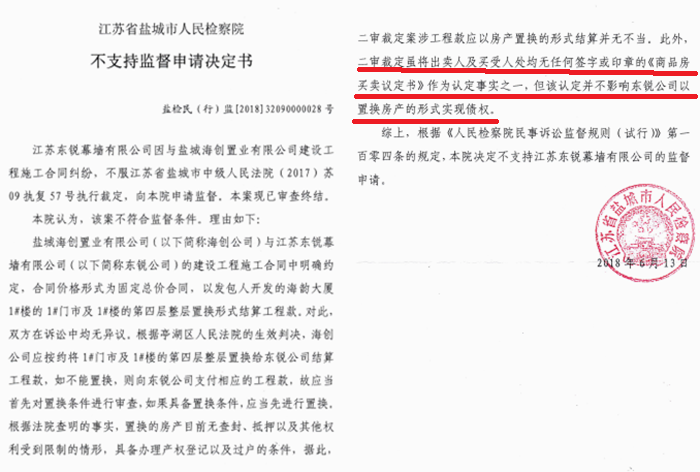 十、盐城市检察院盐检民(行)监【2018】32090000028号不支持监督申请决定书第二页称:“二审裁定虽将出卖人与买受人均无任何签订或印章的《商品房买卖议定书》作为认定事实之一,但该认定并不影响东锐公司以置换的形式实现债权”。此意见与事实不符,是否是官官相护的结果?查明了事实而又不作为,盐城市检察院是否违规不作为?对于东锐公司的监督申请,江苏省高级检察院拒绝受理,是否有意包庇?