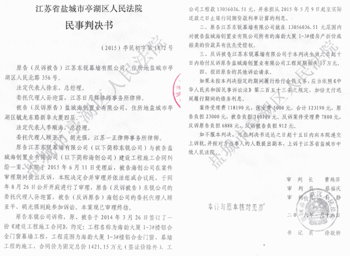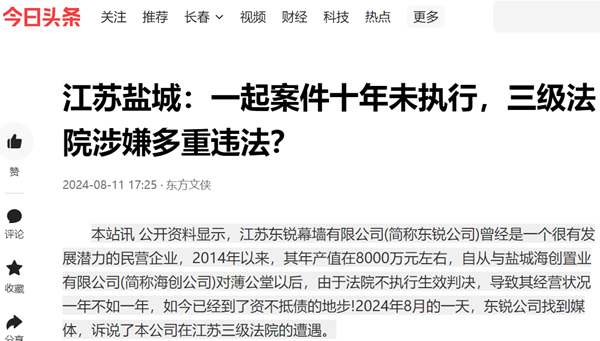 本站讯 公开资料显示,江苏东锐幕墙有限公司(简称东锐公司)曾经是一个很有发展潜力的民营企业,2014年以来,其年产值在8000万元左右,自从与盐城海创置业有限公司(简称海创公司)对薄公堂以后,由于法院不执行生效判决,导致其经营状况一年不如一年,如今已经到了资不抵债的地步!2024年8月的一天,东锐公司找到媒体,诉说了本公司在江苏三级法院的遭遇。